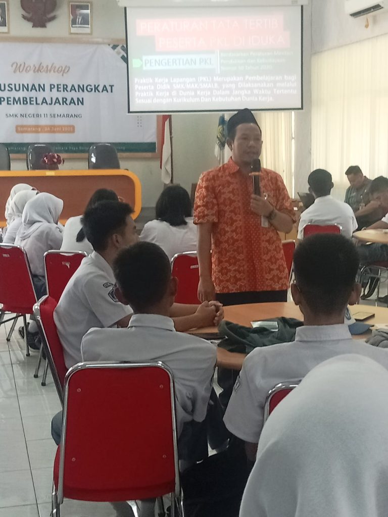 SMK Negeri 11 Semarang menyelenggarakan kegiatan pembekalan Praktik Kerja Lapangan (PKL) gelombang ke-2 yang berlangsung selama tiga hari, mulai tanggal 30 Juni hingga 2 Juli 2025. Kegiatan pembekalan hari pertama dilaksanakan di Lapangan Wirya Khsetra untuk melaksanakan apel dilanjutkan hari ke dua dan ke tiga di Ruang Aula Gedung A lantai 2 untuk kegiatan paparan materi. Pelaksanaan kegiatan pembekalan PKL diikuti oleh seluruh siswa PKL yang terdiri dari siswa kelas XI dan XII dari empat konsentrasi keahlian, yaitu Teknik Grafika (TG), Desain Komunikasi Visual (DKV), Animasi, serta Pengembangan Perangkat Lunak dan Gim (PPLG).
