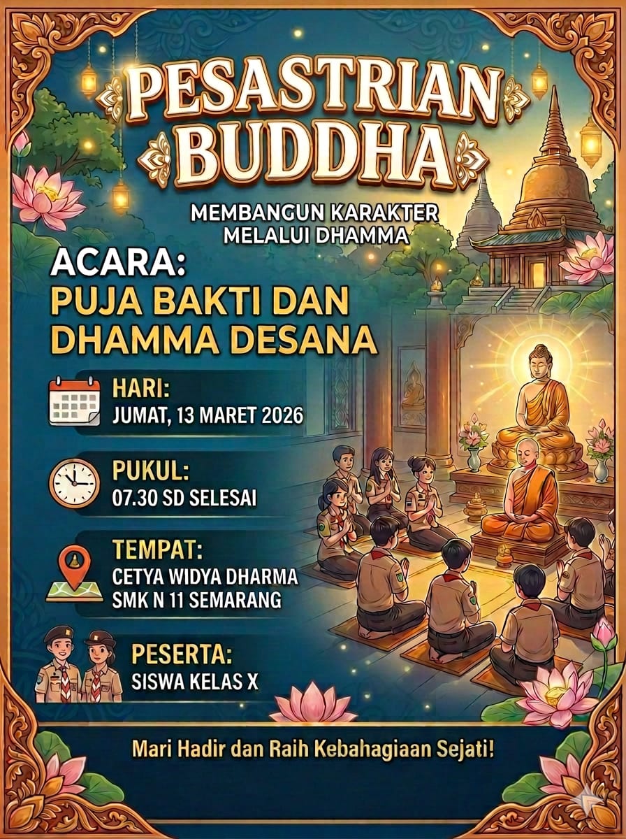 SMK N 11 Semarang, 27 Februari 2026. Di bulan ramadhan ini, murid yang beragama Buddha juga melaksanakan kegiatan pesastrian Buddhis. Dalam kegiatan ini, murid melaksanakan puja bakti pagi, meditasi dan melaksanakan damma vaca atau membaca Dhamma. Pagi ini, Pradipta Binda, murid kelas XII melaksanakan puja bakti pagi hari. Ia membakar hio, mempersembahkan buah dan bernamaskara. Parita suci dibacakan, membaca tekad menjalankan lima Silla (tidak membunuh, tidak mencuri, tidak berzina, tidak berucap salah dan tidak mengkonsumsi zat-zat yang melemahkan kesadaran). Ia juga melakukan meditasi hingga berlangsung 30 menit. Di keheningan itulah, ia fokus pada keluar masuknya nafas.